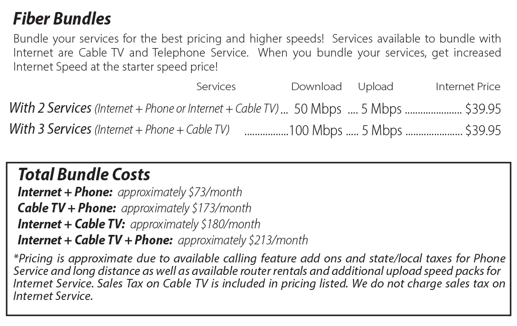 Fiber Optic Internet, Telephone and Digital Cable TV Services are all available! If you have an existing landline phone number, you can keep your phone number! Recently, we increased our Internet Speed Tiers without increasing pricing! If you looked at our Internet before, look again!