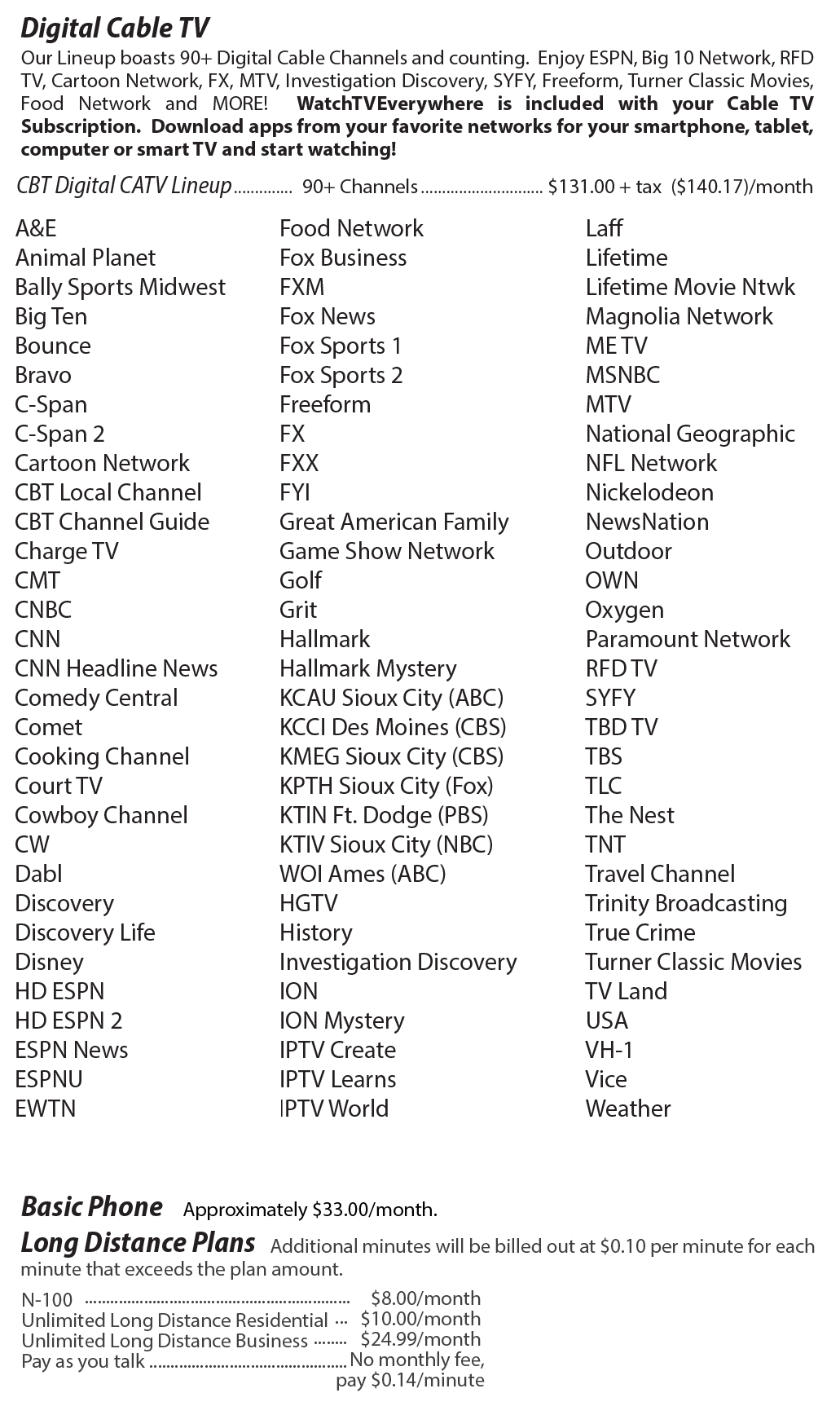 Corn Belt Telephone will be offering Phone Service, our Digital Cable TV and Gig Capable Internet once our Fiber Network is built.