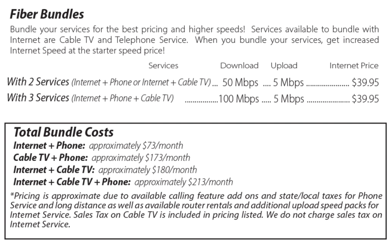 § Installation Charges are non refundable and may be in excess of the standard $125.00 rate for Telephone, Fiber Optic Internet and CATV and $125.00 for Wireless 3.65 Internet if special circumstances or requests are made or required. This rate is subject to change at any time. Additional Jack Installation is not included. Speak to our office staff prior to installation if special circumstances and/or requests are required.